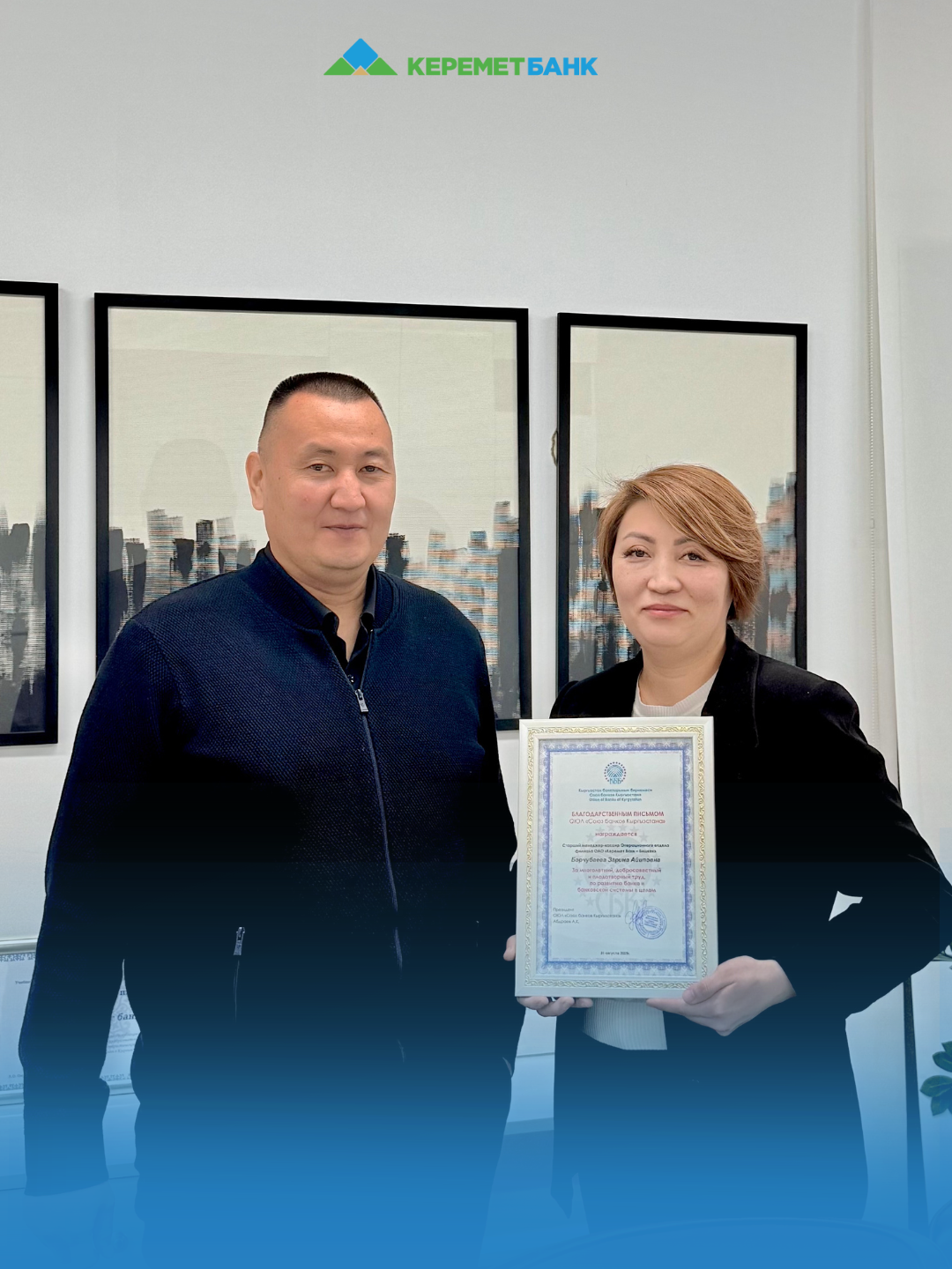 Кесиптештерибизди бул татыктуу сыйлыктары менен куттуктайбыз! Аларга жаңы кесиптик бийиктиктерди, ишенимдүү иш тепкичинен өйдөлөп өсүшүн, чыгармачыл бай ой чабыттарды жана эң бийик денгээлдеги долбоорлорду ишке ашыруу үчүн күч-кубат каалайбыз. Сиздердин талыкпаган эмгегиңиздер жана берилгендигиңиздер "Керемет банктын” бүтүндөй командасы үчүн үлгү болуп саналат.