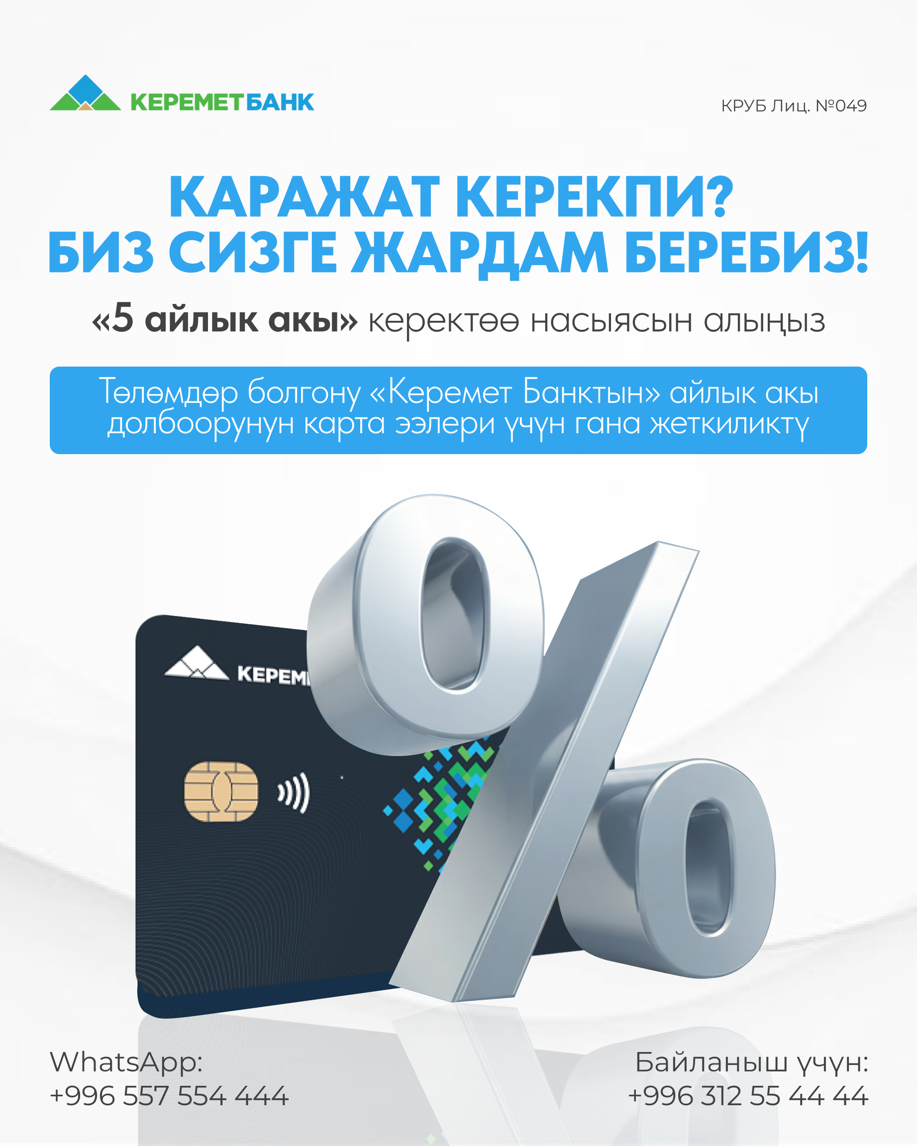 Керемет Банк ААК эмгек акы карталарынын ээлери үчүн атайын "Беш эмгек акы" керектөө кредити боюнча сунушун жаңыртууда:. Бул кредит Керемет Банктын эмгек акы долбоорунун катышуучулары үчүн гана жеткиликтүү.