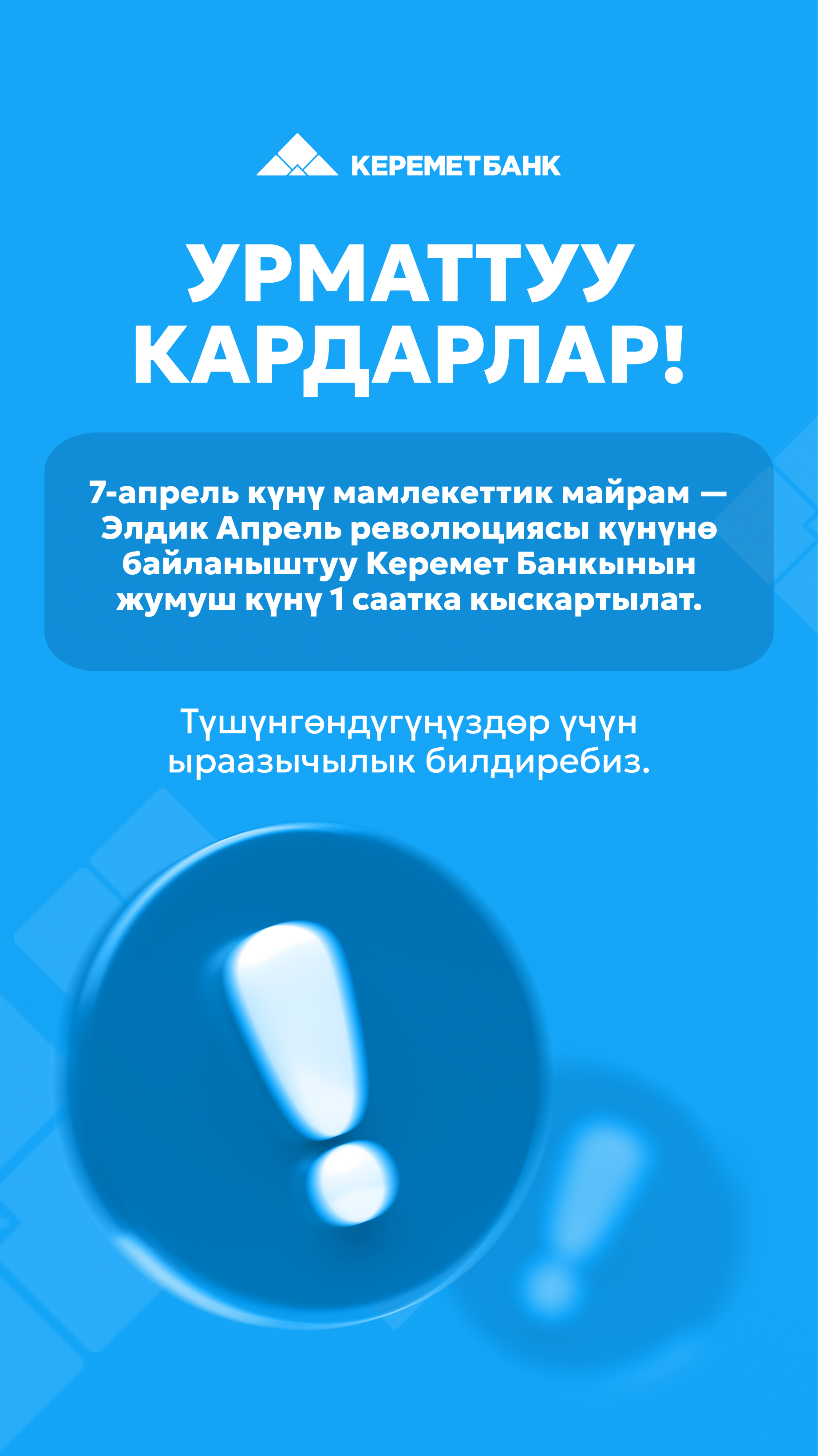 720001, Кыргызская Республика, г. Бишкек ул. Тоголок Молдо, 40/4 Тел: +996 312 55 44 44 Факс: +996 312 31 31 00 Email: call-center@keremetbank.kg